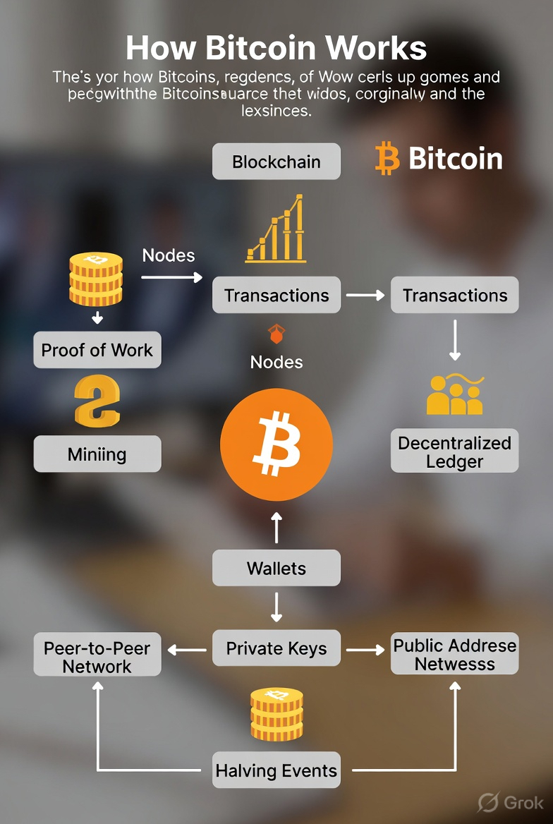 How Bitcoin works explained simply for beginners. Learn Bitcoin mechanics, blockchain basics, mining, and the transaction process in an easy guide.