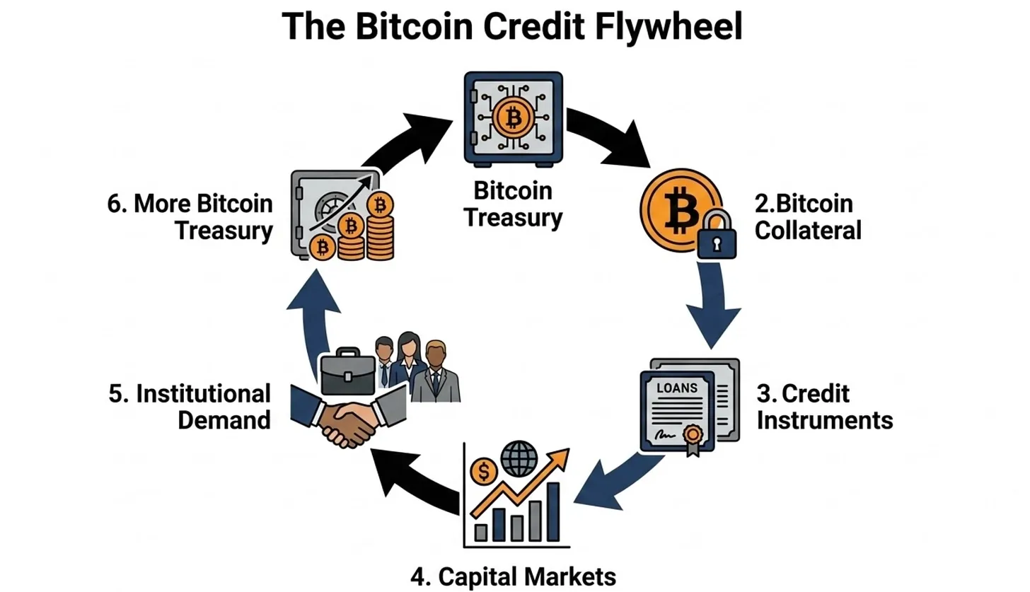 Circular flywheel: Bitcoin Treasury → Bitcoin Collateral → Credit Instruments → Capital Markets → Institutional Demand → back to Bitcoin Treasury.
