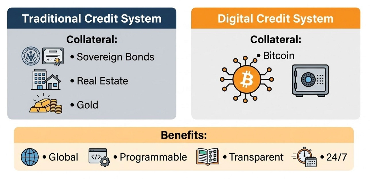 Side-by-side comparison: sovereign bonds, real estate, and gold (traditional) versus Bitcoin collateral global, programmable, transparent, and always open.